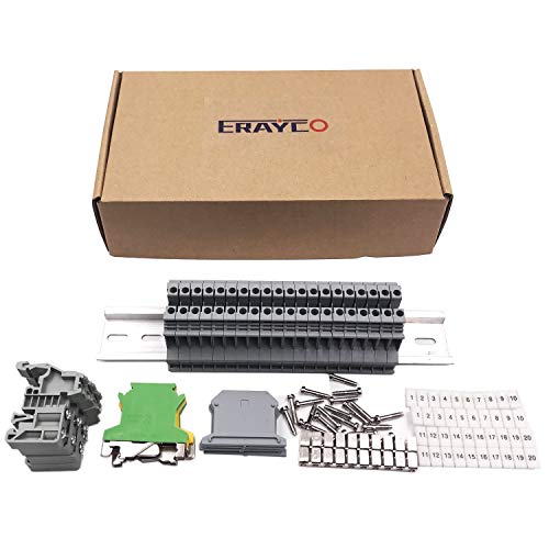Erayco DIN Rail Terminal Blocks Kit, 20Pcs UK-2.5N 12 AWG Terminal Blocks, 2Pcs Ground Blocks, 2Pcs Fixed Bridge Jumpers, 4Pcs End Brackets, 4Pcs End Covers, 4Pcs Marker Strip, 1Pcs 8" Aluminum Rail