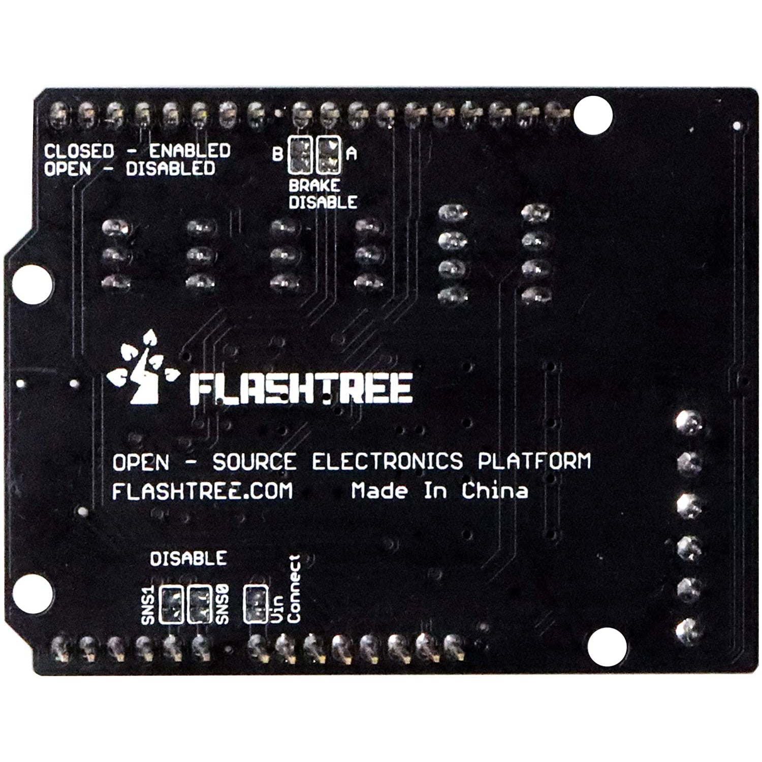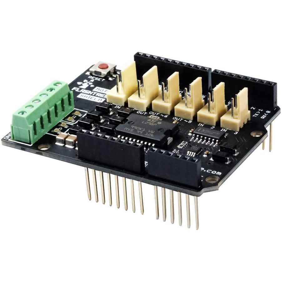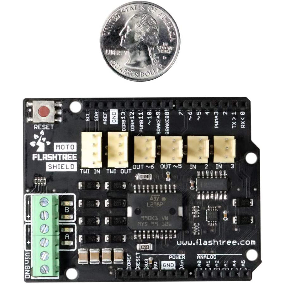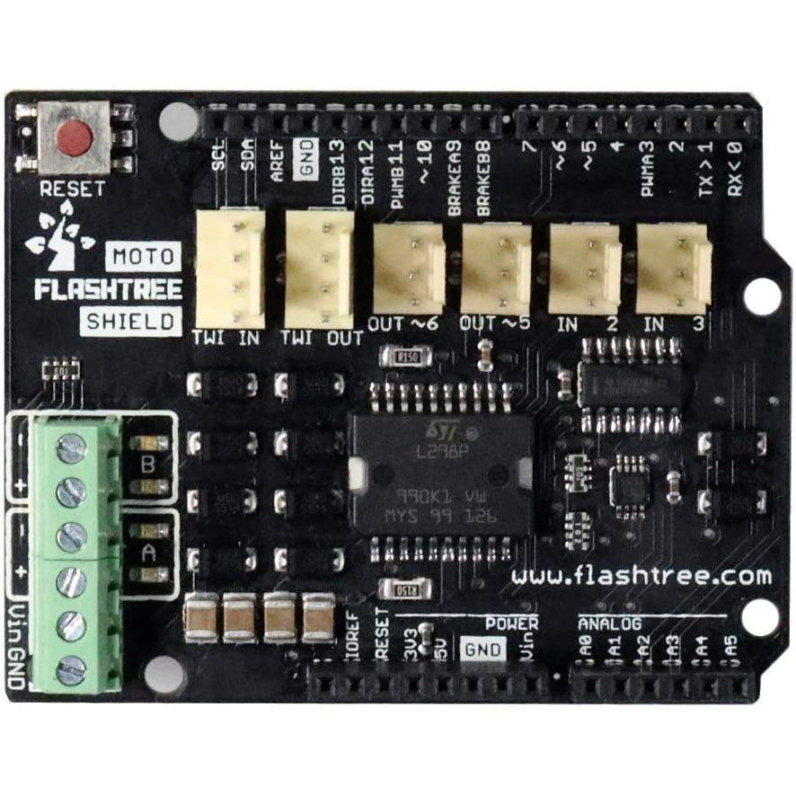 The Flashtree Motor Shield is based on the L298 (datasheet), which is a dual full-bridge driver designed to drive inductive loads such as relays, solenoids, DC and stepping motors. It lets you drive two DC motors with your Uno R3 board, controlling the speed and direction of each one independently. You can also measure the motor current absorption of each motor, among other features. The shield is TinkerKit compatible, which means you can quickly create projects by plugging TinkerKit modules to the board.