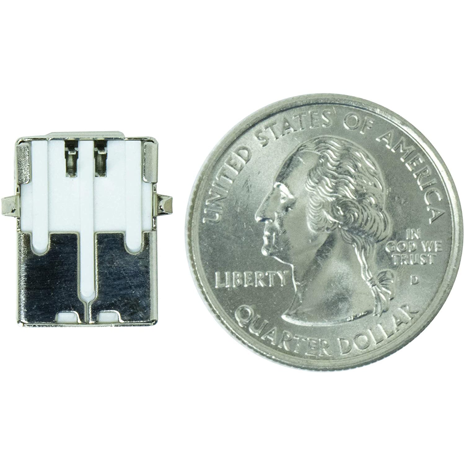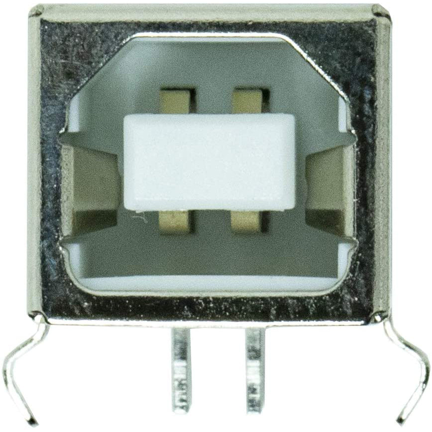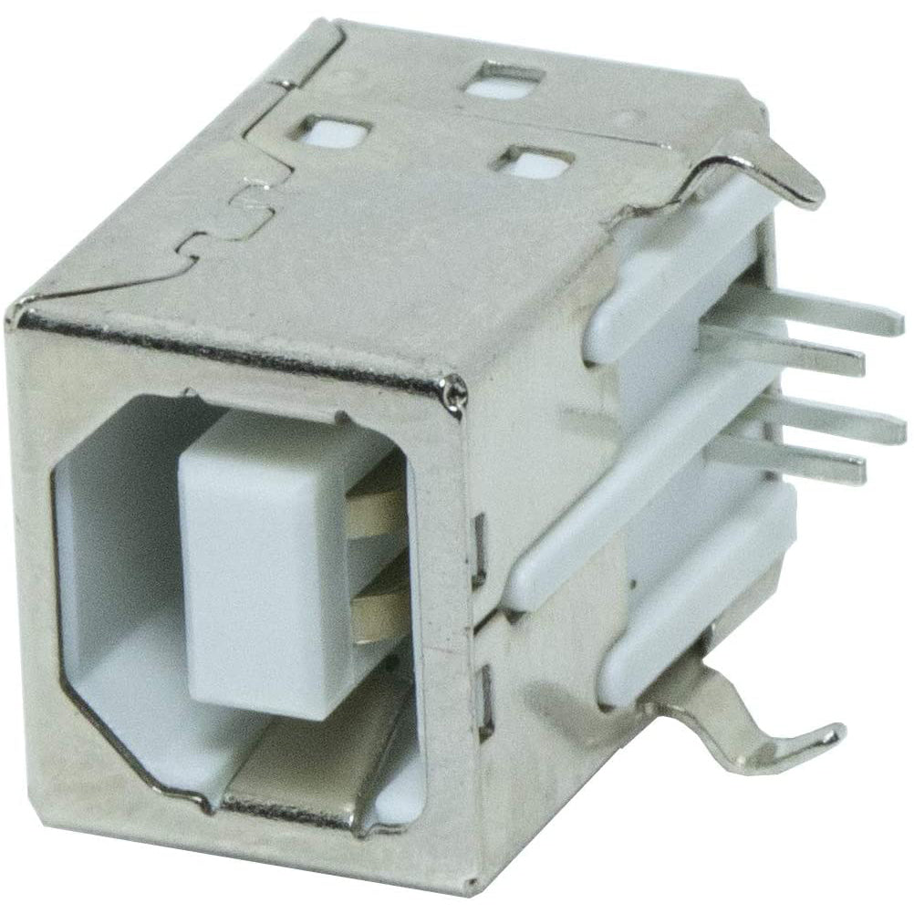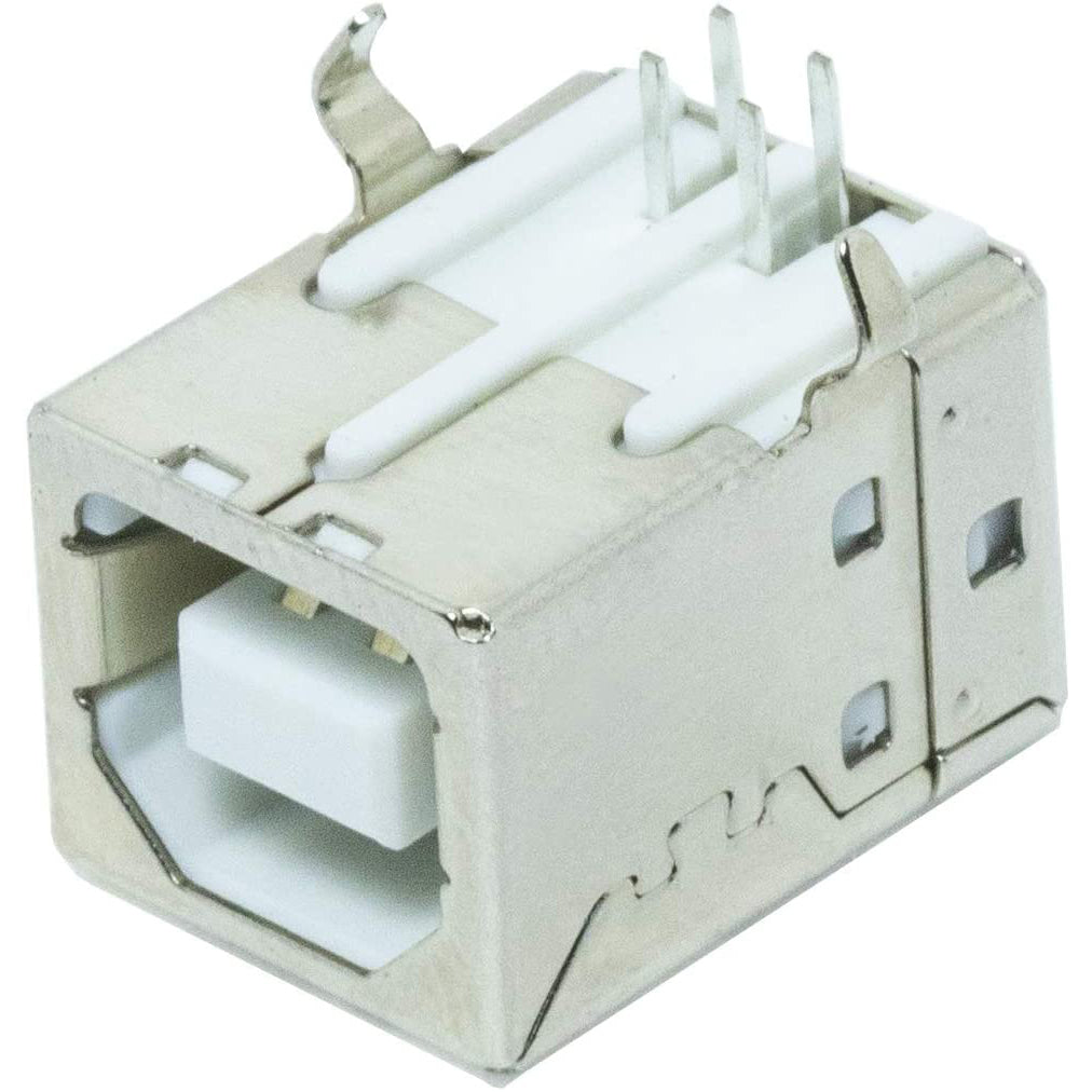 USB Type 'B' Female connector. The 4 connection pins have .1" spacing allowing it to be inserted into development boards and perf boards with mild modification. You can either drill two 80mil holes for the support posts, or cut them off completely. Specifications: Type: USB 2.0 Type B Female Pin Number: 4-Pin Features: 90 Degree Pins Rated Current: 1.5A; Voltage: 30V Total Size: 16mm x 12mm x 14.5mm / 0.63" x 0.47" x 0.57" (L*W*H) Material: Plastic, Metal; Color: Silver Tone, White Package Content: 10 x USB Jack Socket Connector Descriptions: 1.USB 2.0 Type B 4 pin Female Jack, -in pins design. 2.Compact, lightweight, and durable. Very easy to use. DIY your own USB adapter. 3.Excellent USB replacement for PCB board, projector and printer USB socket. 4.Fit for electronics power port repair or DIY projects power supply port.