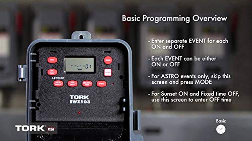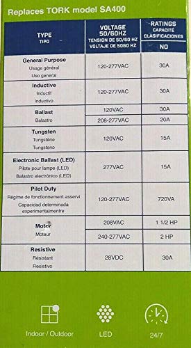 Details: This NSi Industries EWZ103 digital time switch accepts 120-277 VAC input and its DPST output contacts can activate a 40 amp load or 2 hp motor. The switch automatically detects the input voltage and does not require manual voltage setting. This timer includes 20 pairs of on/off set points, has a minimum cycle time of one minute, and is suitable for individualized daily operation. A rechargeable super capacitor provides four days of backup power to maintain time and schedule settings. This timer can adjust for daylight saving time and leap year and compensate for sunrise and sunset variation based on Earth's latitude. The double-pole single-throw (DPST) contacts are housed within a Noryl plastic alloy enclosure that meets NEMA-3R standards for water resistance and has a lockable hasp. The enclosure is suitable for both indoor and outdoor use and mounts to an external surface. This digital timer is Underwriter Laboratories (UL) Listed and Canadian Standards Association (CSA) certified for quality assurance and is suitable for controlling lighting, heaters, and equipment motors. Specifications Switch type Digital 7-day, 24-hour timer with 20 unique set points each day Input power supply 120-277 VAC, 50/60 Hz, 6 W power consumption, automatic voltage detection, rechargeable super capacitor backup Output contacts DPST contacts, 40 amp load rating, 2 hp motor load rating On/off control One-minute minimum on/off cycle, up to 20 cycles per 24 hours Enclosure NEMA-3R Noryl plastic alloy enclosure with clear plastic cover, indoor/outdoor use, external surface mount Terminal wire size range #8 to #16 AWG (American wire gauge) Operating temperature range -40 to +149 degrees F (-40 to +65 degrees C) Standards met UL Listed, CSA certified Automatic switches are used to turn on or off electrical devices and are activated by time, light, and motion. Time activated switches (also known as timers) operate at preset time intervals during a daily or weekly period and can be either mechanical or electronic. Mechanical timers feature a dial with multiple pins to set the on/off time intervals. Electronic timers feature an LCD display and pushbuttons to set the time intervals. Light activated switches (also known as optical or photo) operate when ambient light levels reach preset values, generally measured in foot candles. Motion-activated switches (also known as motion sensors) operate when an electronic field of a preset range is interrupted. These switches can include energy saving logic that uses combinations of time, light, and motion to operate and can include one or more device outlets or circuit contacts. Automatic switches are used to control indoor lights, outdoor lights, appliances, and small equipment motors. NSi Industries manufactures electrical components and sensors, lighting products, and energy management products. The company, founded in 1975, is headquartered in Huntersville, NC.